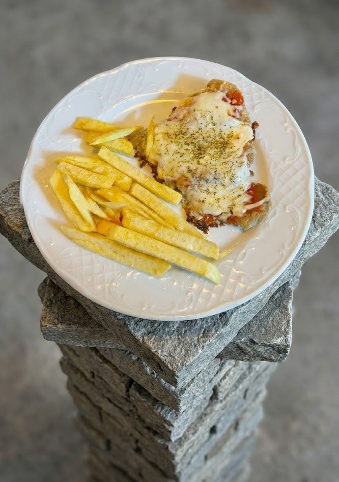 Nuestro plato estrella para. Ternera tierna empanada, cubierta con salsa de tomate natural, jamón y una capa generosa de mozzarella gratinada con orégano. Servida con patatas fritas de verdad.