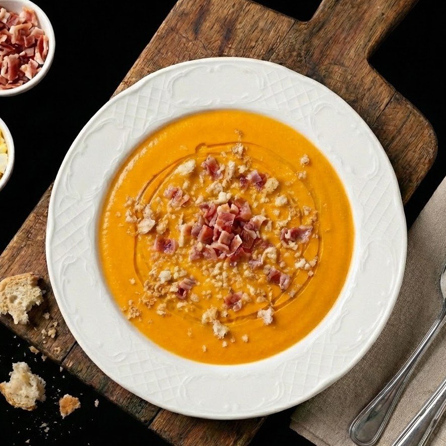 Cremoso, suave y con el equilibrio perfecto. Elaborado con tomates maduros, nuestro mejor aceite de oliva virgen extra y coronado con virutas de jamón que le dan el toque salado irresistible.